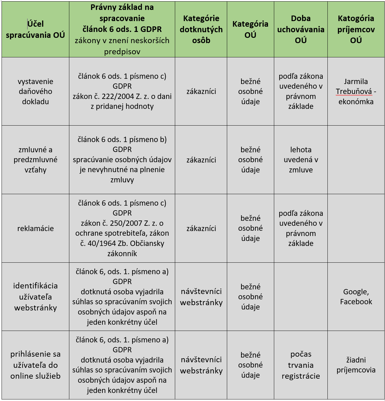 Účely spracúvania, právne základy spracúvania, kategórie dotknutých osôb, doba uchovávania OÚ, príjemcovia OÚ
